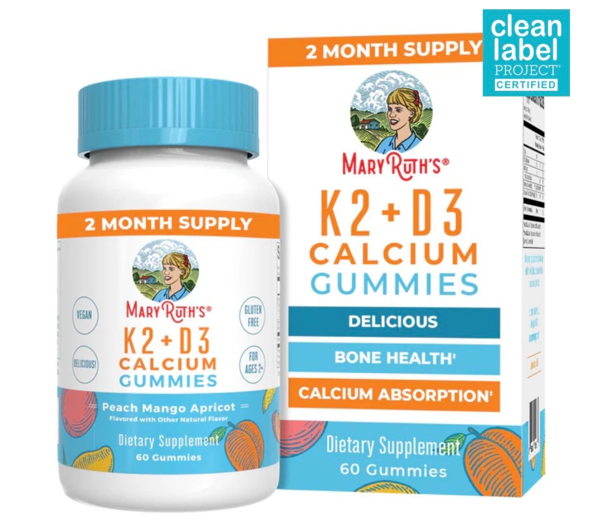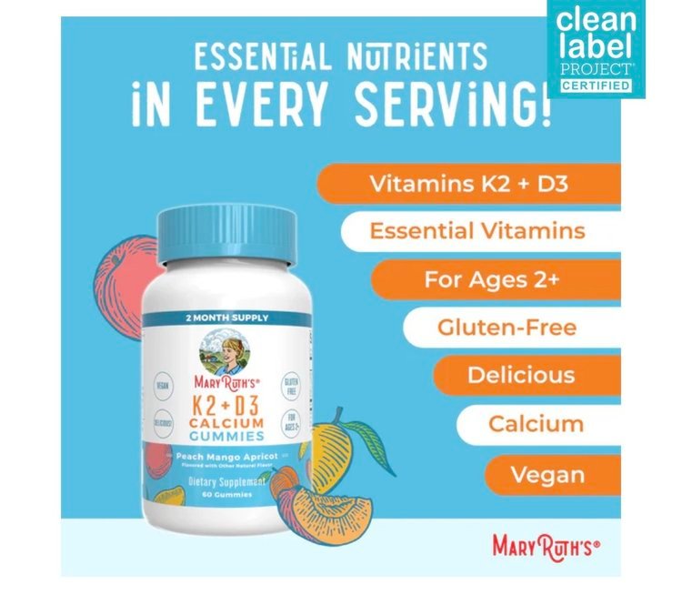 Free of Common Allergens: MaryRuth Organics K2 D3 Calcium Gummies are Non-GMO, No Gelatin, Pectin Based, Vegan, Made in a GMP (Good Manufacturing Practice) Facility. Dairy Free, Nut Free, Gluten Free, Made with Organic Cane Sugar. Kid Friendly. Clean Label Project Verified. B Corp Certified.