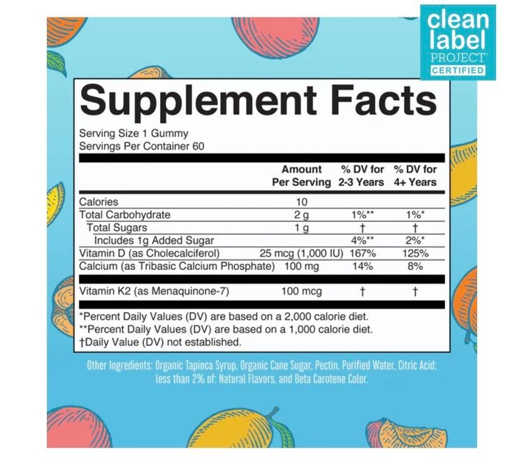 Vitamin D3 K2 Calcium Gummies: Our delicious gummies have three flavors in one bottle: Peach, Mango & Apricot, and are made from lichen and natto. Very few foods in nature contain vitamin D and most D3 supplements are sourced from lanolin — the fat of lamb’s wool; ours is sourced from lichen.